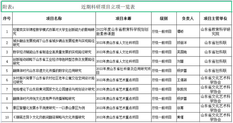 山东省社科联发布了2022年度山东省人文社科课题立项名单,我校4位老师课题获批立项,分别是矫丽洋主持的《城乡融合发展视阀下山东省城乡耦合发展程度与实现路径研究》、吴国艳主持的《数字经济赋能山东省制造业高质量发展的实现路径研究》、刘慧主持的《创新驱动战略下山东省工业经济绿色转型态势及发展路径研究》和杨梦蕾主持的《融媒体时代山东非遗文化传播的数字化应用研究》,其中杨梦蕾老师获得的是山东省社科普及应用研究项目立项。