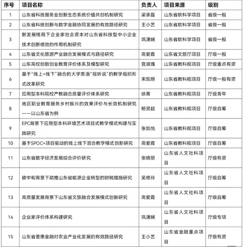 近日,山东省科技厅公布了2021年度山东省软科学项目立项名单,我校3项课题获批立项;山东省文化和旅游厅公布了2021年度全省文旅研究项目立项通知,我校1项课题获批立项;山东省教育科学院公布了2021年度“十四五“规划课题立项名单,我校6项课题获批立项;山东省社科联公布了2021年度人文社科课题和金融重点课题立项名单,我校5项课题获批立项。