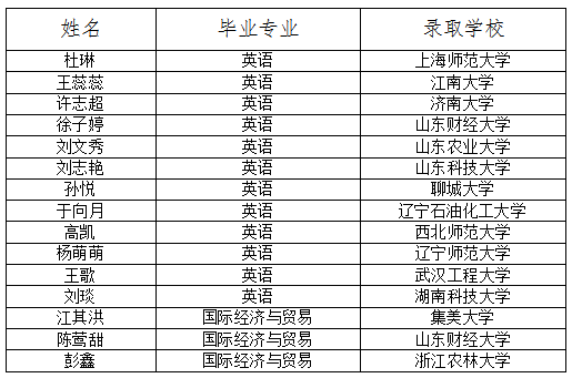 国际商学院2022届毕业生参加全国硕士研究生招生考试取得好成绩。2018级英语专业和国际经济与贸易专业共15名同学考取硕士研究生。其中英语专业录取11人,国际经济与贸易专业录取4人。英语专业录取率高达38%,创国际商学院学生考研录取率新高。